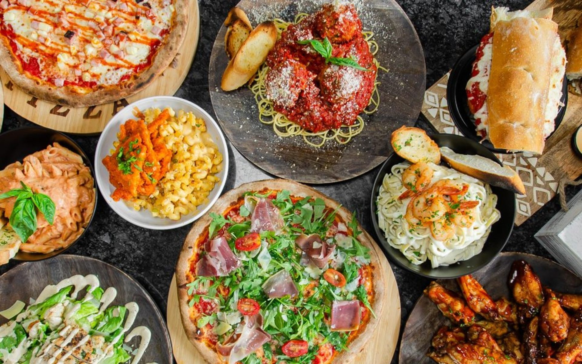 Pizzas: Margherita, Prosciutto di Parma, Truffle Wild Mushroom, Pepperoni, Meat Lovers